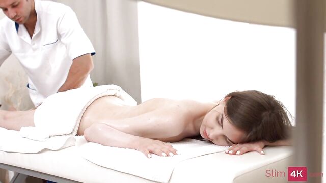 Description:A slender teen came for a massage from a muscular masseur. She completely undressed and completely relaxed before getting aroused by a shaved pussy massage. Covered in oil, she sat on the man's big dick and then got filled with cum in the doggy style position.