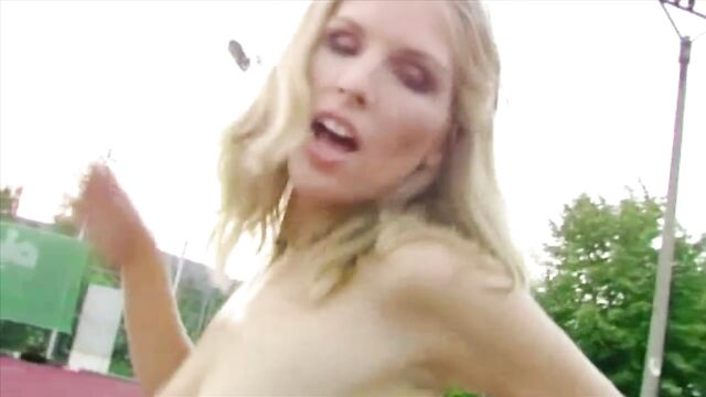 Descrição: Sexy blonde Sharon takes it deep to the throat and hard in the pussy. Our stud cums deep inside her and a jet of hot cum comes streaming out.