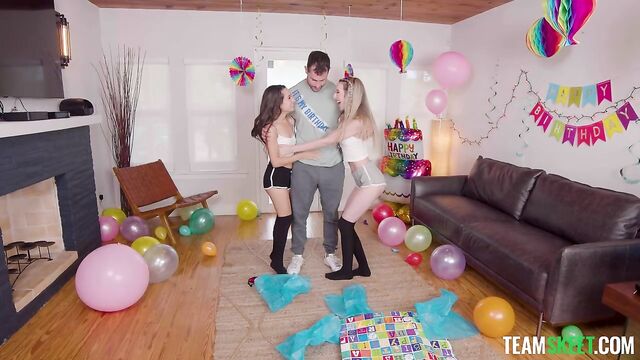 Description:It’s Duncan’s birthday and he’s celebrating with tiny cuties Freya and Sophia. They all take turns trying to break the pinata and when it does, a bunch of dildos come out of it! It’s time to give Duncan his birthday present, so they all rush inside and the girls drop to their knees as Duncan whips out his huge cock!